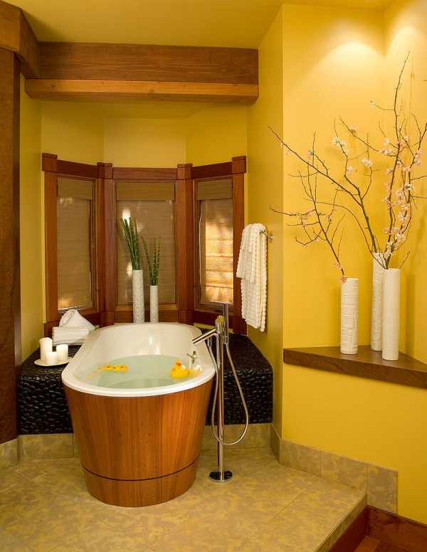 New modern yellow bathroom with beige tiles and brown cabinet Modern Yellow Bathroom.