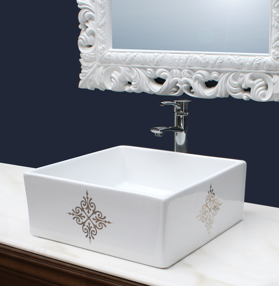 Fancy Emblem Hand Painted Sink in a Navy Blue Bathroom ...